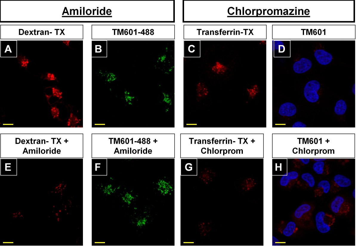 In addition, the effect of chlorpromazine and amiloride on endocytosis of transferrin-Texas-Red (TX-Red) at 35 μg/ml according the protocol by Pho et al (23) or dextran-TX (21) at 0.1 or 1 mg/ml (both from Invitrogen, Carlsbad, CA) were evaluated, respectively. Dextran conjugate was selected with a similar molecular weight (~3000 kDa) as TM601 (~4000 kDa). In these experiments cells were grown in MatTek's glass bottom dishes. Endocytosis of transferrin was studied using confluent cell monolayers that were pre-treated for 45 min at 37°C in 5% CO2 incubator with 1% FBS supplemented medium alone or with medium containing chlorpromazine at 10 μg/ml. Next, the reaction medium was removed and replaced with 1% FBS supplemented growth medium containing 35 μg/ml transferrin alone or with addition of chlorpromazine at 10 μg/ml for the respective pre-treated cultures and incubated for 20 minutes at 37°C in 5% CO2. Endocytosis of dextran was studied also using confluent cell monolayers that were pre-treated for 30 min at 37°C in 5% CO2 incubator with 1% FBS supplemented medium alone or with medium containing amiloride 300 μM. Next, the reaction medium was removed and replaced with 1% FBS supplemented growth medium containing 0.1 or 1 mg/ml of dextran (21) alone or with addition of amiloride 300 μM for the respective pre-treated cultures and incubated for 1 or 24 h at 37°C in 5% CO2. At the end of the treatment, the reaction medium from all cultures was removed, cells washed 3 times and direct fluorescence of cells treated with transferrin -TX or dextran-TX was evaluated by confocal microscopy.
