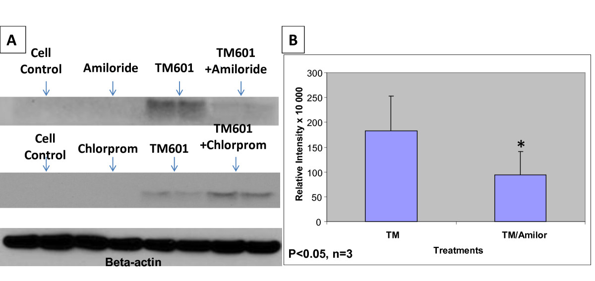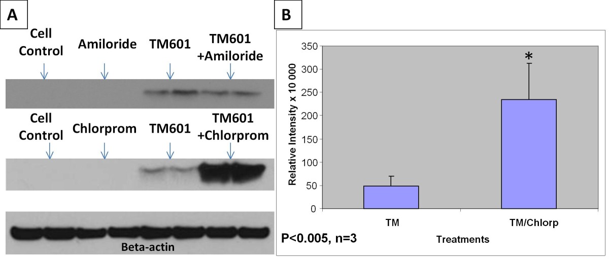 Western blots of TM601 (10 μM) - treated NHDF fibroblasts in presence or absence of 300 μM amiloride or 10 μg/ml chlorpromazine (A). Lysates of trypsinized cells were used at 9-12 μg protein. Beta-actin was used as a sample loading control (representative data of n = 3). The statistically significant 2 fold (p < 0.05) effect of amiloride (Amilor) on TM601 (TM) level is shown on the graph (B). The chlorpromazine had a small, statistically not significant effect on TM601 level (A). The data represent n = 3 experiments using duplicate samples/per experiment (total of 6 samples).