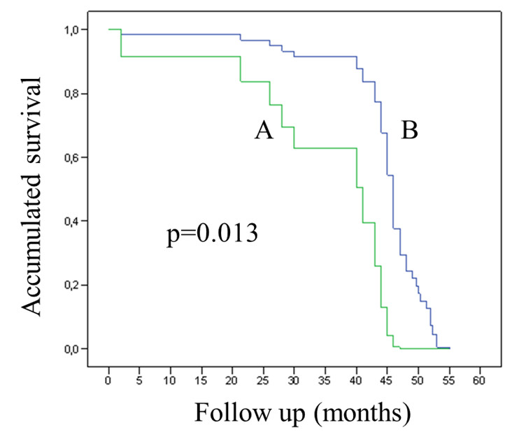 In this study, HPV and EBV sequences were searched in BCs from patients living in Santiago of Chile. Fifty-five formalin-fixed paraffin-embedded BCs from different public and private hospitals were collected and the extracted DNAs analyzed for integrity by amplifying a 110 bp fragment of the betaglobin gene. Forty-six samples out of 55 were betaglobin positive (84%). Using conventional PCR for a 65 bp fragment of L1 region, HPV was detected in 4/46 (8.7%) BCs. Using qRT-PCR for EBV EBNA-1, EBV was present in 3/46 (6.5%) BCs. Co-infection with both viruses was only detected in 1/46 (2.1%) cases. In addition, ISH for EBER-1 showed that all of the BCs were EBV negative. A non-statistically significant association between HPV presence and age, tumor size, histology and differentiation grade was found (p = 1.000; 0.780; 1.000 and 0.721 respectively, Table 1). HPV infection was more frequently detected in primary tumors from patients with metastatic lymph nodes, although it was not statistically significant (p = 0.078). On the other hand, no statistically significant association between EBV presence and age, lymph nodes involvement, tumor size, histology and differentiation grade was found (p = 1.000, 1.000, 0.459, 0.130 and 0.255, respectively, Table 1). Using a Cox-regression model, a statistically significant association between EBNA-1 positivity by qRT-PCR and poor survival was found (p = 0.013, Figure 1). The Inno-Lipa method showed that only the HPV-16 genotype was present in HPV positive BCs without co-infections with other HPV genotypes. In addition, the number of copies of HPV-16 determined by real-time PCR was extremely low in 1/4 cases studied (0.14 copies/cell). In the other three cases, the viral load was higher (1.2; 2.0 and 33.8 copies/cell, Table 2). The absence of E2 amplification showed that HPV-16 was completely integrated into the host genome in all of the cases. In addition, we were unable to detect HPV16 E6 and E7 transcripts in 3/3 HPV-16 positive cases as showed using transcriptase-reverse real-time PCR, even though the specimens were positive for β2-microglobulin expression (Table 2).