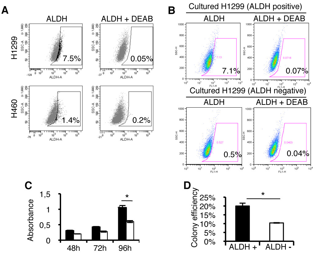 We initially analyzed the ALDH+ population of the H1299 and H460 NSCLC cell lines. FACS analysis revealed a clear ALDH+ population that was blocked by co-incubation with the specific enzyme inhibitor DEAB. Average percentages of ALDH+ cells were 7.57 ± 3.64% for H1299 cells, and 1.96 ± 0.83% for H460 cells; representative FACS images are shown in Figure 1A.