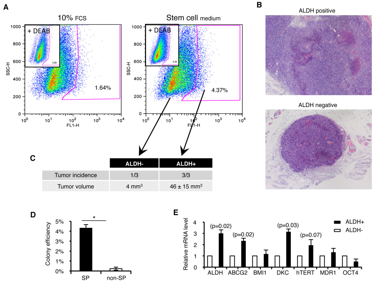 A: Representative ALDH cytometry from H460 unsorted cells grown in presence of 10% FCS-containing medium or stem cell medium. Percentage of ALDH+ cells in H460 cell line was increased when cultured in stem cell medium. B: Hematoxylin eosin staining of tumors engrafted after injection of ten thousand H460 ALDH sorted cells (40X). C: Tumor incidence and volume three weeks after cell injection. D: Isolation of both SP and non-SP cells present higher colony formation efficiency in soft agar than their negative counterpart. E: Q-RT-PCR analysis in sorted H1299 cells confirmed higher expression of ALDH and ABCG2 in ALDH+ cells. These cells also overexpress dyskerin, a component of telomerase subunit. Data and error bars are presented as mean ± SEM; *: p < 0.05, or as indicated.