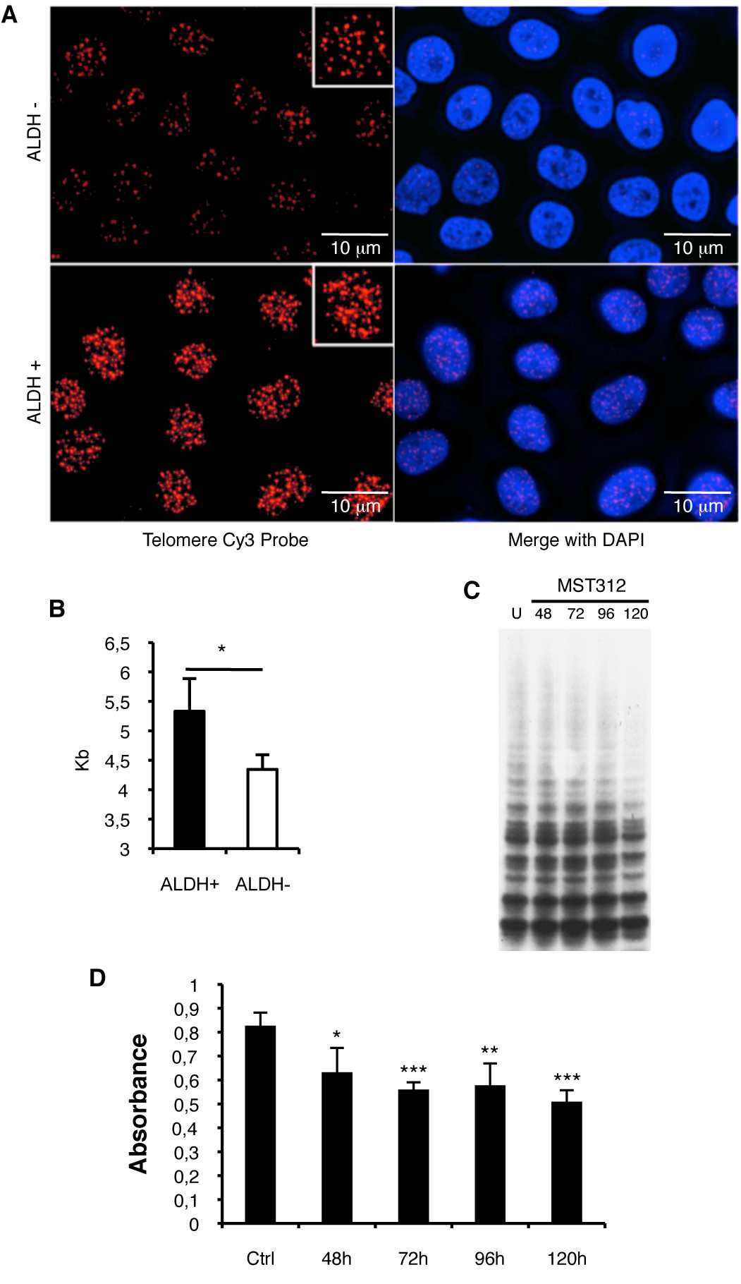 We next quantified TL in the ALDH+/- cell population in vivo. To this end, FICTION (Fluorescence Immunophenotyping and Interphase Cytogenetics as a tool for the Investigation of Neoplasms) was performed in order to evaluate simultaneously TL (with the probe specific for telomeres) and ALDH+ cells (by immunofluorescence) (Figure 7C and 7D). Similarly to our in vitro observations, results showed that the ALDH+ population had longer telomeres (5.37 ± 0.72 Kb) than ALDH- cells (3.99 ± 0.11 Kb) (p < 0.001) in control mice. We tested whether MST312 was also able to reduce telomere length in xenotransplants. A significant reduction of TL in ALDH+ cells after treatment (3.67 ± 0.54 Kb, p < 0.05) compared to untreated ALDH + cells was found (Figure 7C). Since massive necrotic areas were found in the ALDH- tumor mass, TL could not be accurately measured. Nonetheless, results in the ALDH+ population confirm that MST312 reduces TL in vivo.
