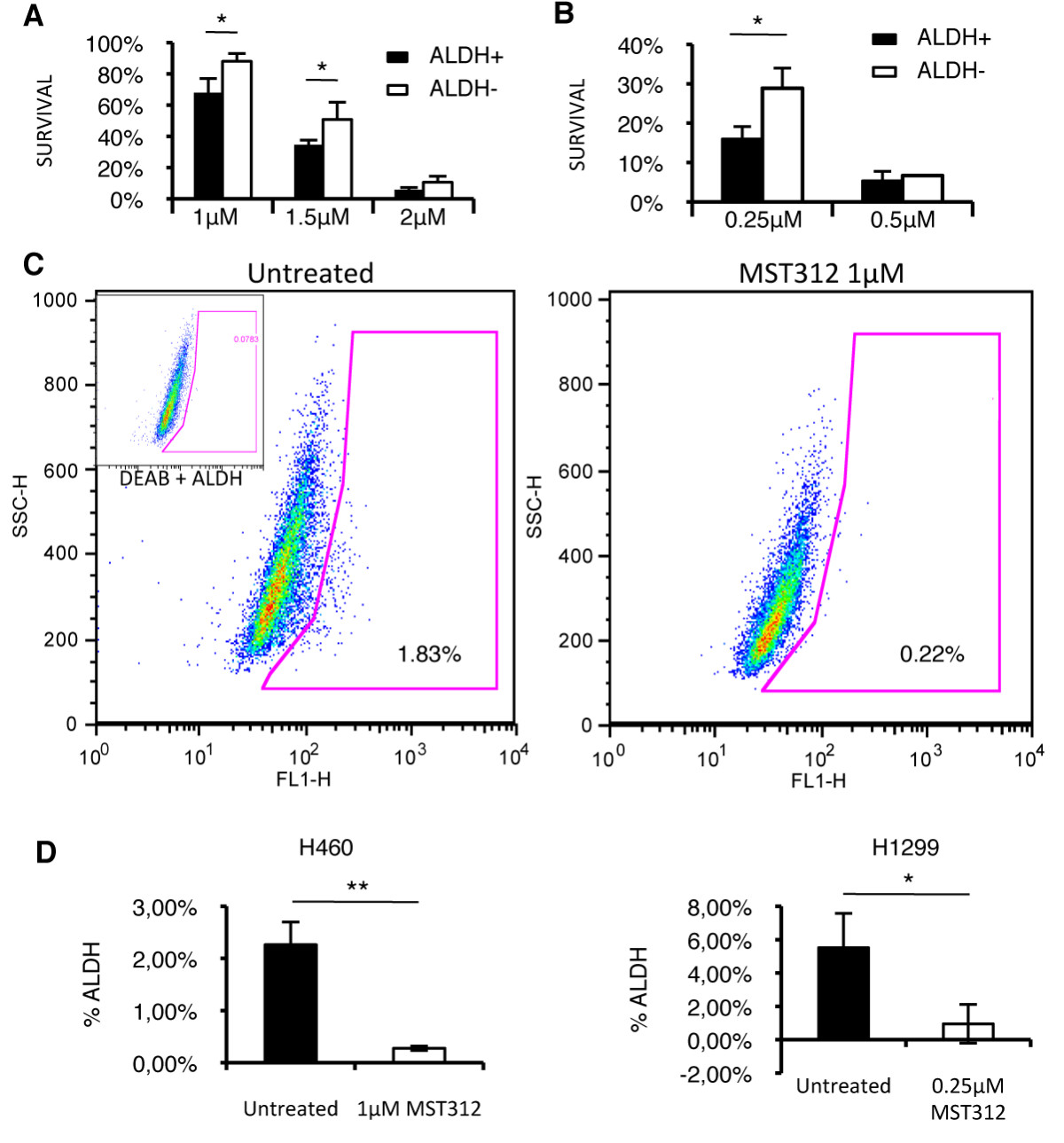 To further demonstrate that MST312 altered the number of ALDH+ cells, the whole unsorted cell population was treated for 5 days with the compound and the number of ALDH+ cells was analyzed. Figure 4C shows a representative FACS image in H460 cells demonstrating an eightfold decrease in the number of ALDH+ cells upon MST312 treatment (p < 0.05). Quantifications show a significant decrease in the amount of ALDH+ cells after treatment for both cell lines (Figure 4D).