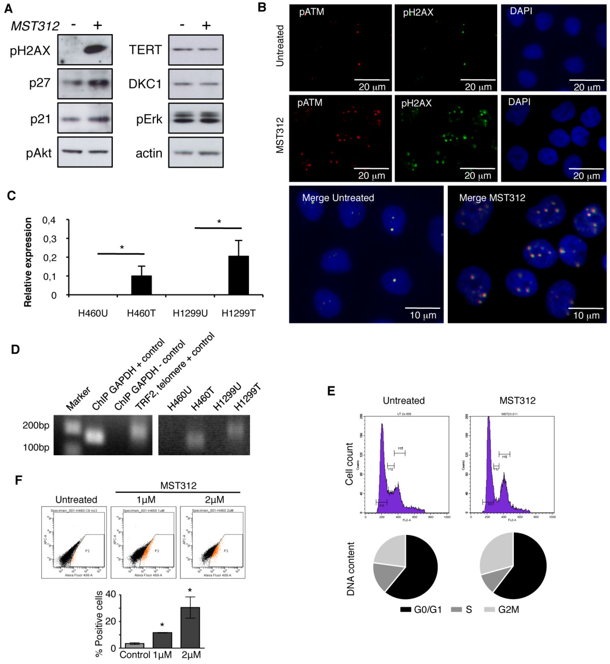 To uncover the anti-tumor mechanism responsible for MST312 activity, western blots were performed to measure key downstream telomerase-related signaling proteins. A recent study reported that MST312 induces G2/M cell cycle arrest and acute ATM-pathway-dependent DNA damage in astrocytoma cells (26). Treatment of H460 cells with MST312 for 72 h resulted in strong increase in the amount of pH2AX (Figure 5A). This result was validated by immunofluorescence. In H1299 untreated cells, low levels of pH2AX and pATM were found and signals for both proteins colocalized (Figure 5B). Administration of MST312 resulted in an increase in pATM and pH2AX signals, which also colocalized (Figure 5B). The same results were observed in H460 line (see additional file 2, Supplementary figure 2D). To further investigate whether MST312 was directly damaging telomere DNA, a ChIP assay was performed to determine if pH2AX binds telomere ends upon treatment. H460 and H1299 cell lines were treated for 72 h with MST312, immunoprecipitated for pH2AX and then telomere sequences were amplified by PCR. In both cell lines, telomere sequence was detected in treated samples but not in untreated cells (Figure 5C and 5D). These results show the activation of pATM/pH2AX pathway within the telomeres by MST312.