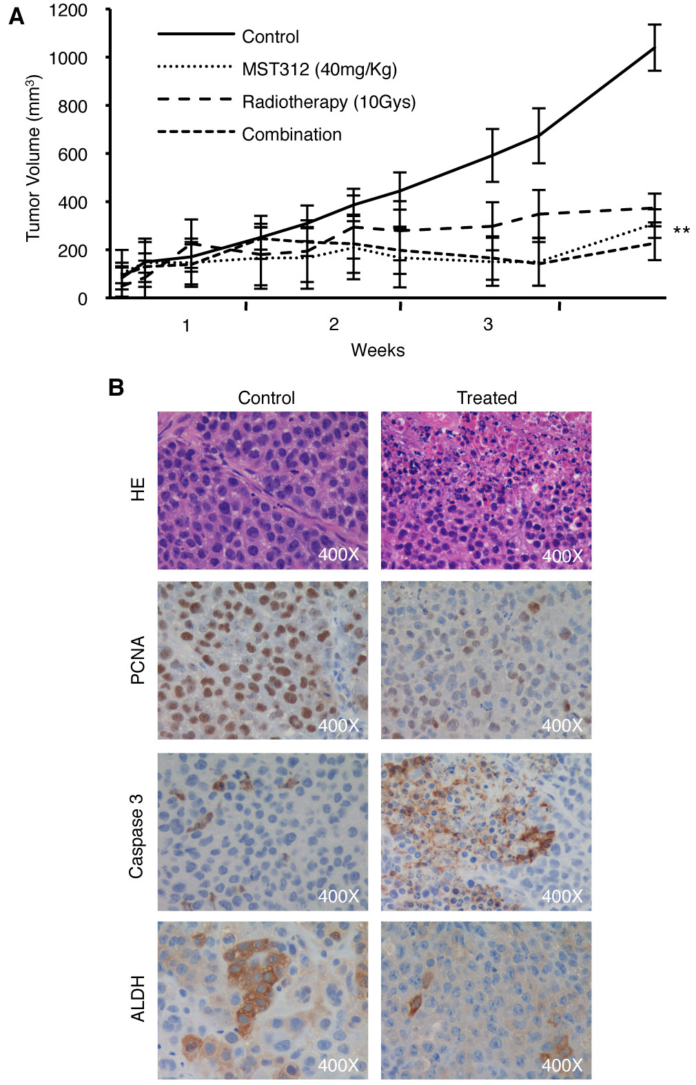 A: Tumor growth shows strong reduction in mice that were treated for 3 weeks with MST312 (40 mg/kg, daily). Radiotherapy alone (10 Gys administrated locally at days 3 and 13) produced a similar effect. No significant improvement was obtained by combination of both therapies. B: H&E of untreated and MST312-treated mice (upper panel) show tumor cells with pyknotic nuclei upon treatment; immunohistochemistry for PCNA and cleaved-caspase 3 (middle panel) demonstrate a reduction in proliferation and increased apoptosis in mice injected with MST312, compared to controls; immunostaining for ALDH (lower panel) also reveals a reduction in the number of labeled cells after administration of the telomerase inhibitor.