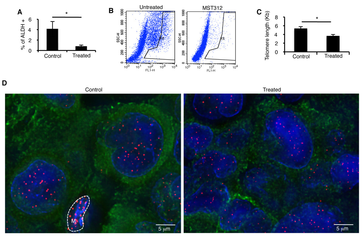 A and B: FACS analysis and quantification of dissociated tumors confirms, along with the immunhistochemical results, a decrease in ALDH+ cells in vivo after treatment with MST312. C: Quantification of telomeric length in ALDH+ cells present in tumors from treated and untreated mice. A significant reduction is found in mice administered with the antitelomeric therapy (p < 0.05). ALDH negative cells from the tumor bulk could not be accurately quantified due to massive necrosis. D: Representative FICTION image using probes for telomeres (red), immunofluorescence for ALDH (green), and nuclear staining (DAPI, in blue). Images show a lower intensity for telomeres in MST312-treated mice. The "M" labeled cell represents a murine fibroblast excluded from the analysis (small nuclei and longer telomeres).