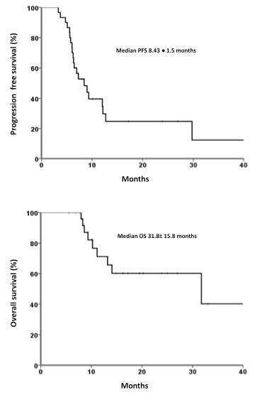Median Progression-free survival (PFS) and Overall survival (OS) were 8.43 ± 1.5 and 31.8 ± 15.8 months, respectively. PFS was 39.5% at 1 year and 24.7% at 2 years. The 1- and 2-year OS rates were 71.1 and 60.2%, respectively. Three-year OS was significantly superior for patients with N0-N1 stage disease vs. N2-N3 (60 vs. 24%, respectively; Response rate [RR], 0.03; p= 0.038).