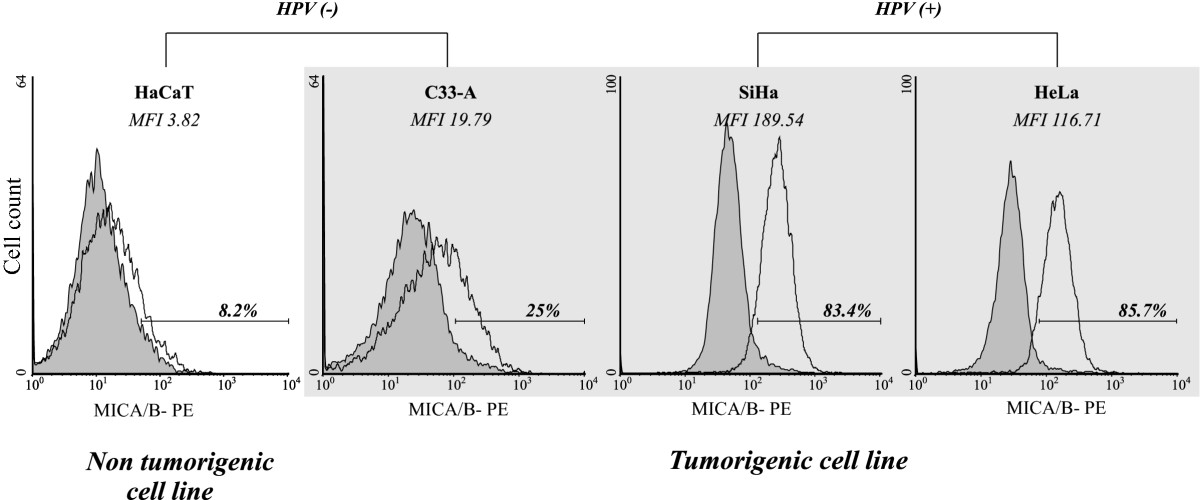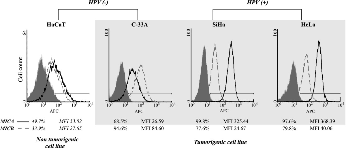 Flow cytometry analysis to detect MICA and MICB separately was carried out on HaCaT, C33-A, SiHa and HeLa cells to determine the percentage and the mean fluorescence intensity of MICA and MICB. Results were analyzed using the program WinMDI (filled gray curves: isotype control, black curves: anti-MICA, gray curves: anti-MICB).