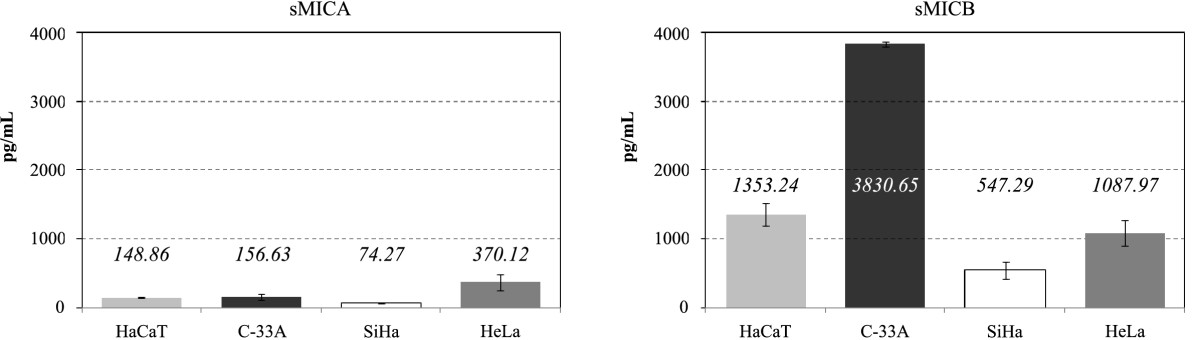 Next, the release of soluble MICA and MICB into the cell culture supernatants of subconfluent cultures of HaCaT, C33-A, SiHa and HeLa cells was analyzed by ELISA. As shown in Figure 4, all four-cell lines released more soluble MICB than soluble MICA, and this effect was more pronounced in C33-A cells, which exhibited titers as high as 3830.65 pg/mL. This finding was similar to the result obtained by flow cytometry, which had revealed a high cell surface expression of MICB in C33-A cells. On the other hand, the highest level of soluble MICA was found in supernatant of HeLa cells, reaching 370.12 pg/mL. Taken together, these results point to a preferential release of MICB by the four cell lines, with the highest levels in HPV-negative cell lines.