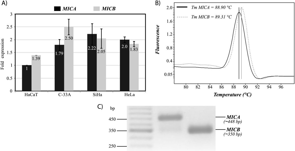 A) Relative expression of MICA and MICB in each cell line was performed by Real-Time PCR using GAPDH, β-Actin and L32 ribosomal protein as reference genes. The "fold expression" (ordinates) was obtained by normalizing the data values taking MICA expression of HaCaT cells as 1. The figure represents the average ± SD of the relative expression obtained with the reference genes. B) Temperature melting analysis performed by Real-time RT-PCR shows amplification of only one specific peak for each set of primers. C) Specificity of MICA and MICB amplification fragments was demonstrated by running the amplification products on 1.5% agarose gel, giving a fragment of approximately 448 bp for MICA and 350 bp for MICB.