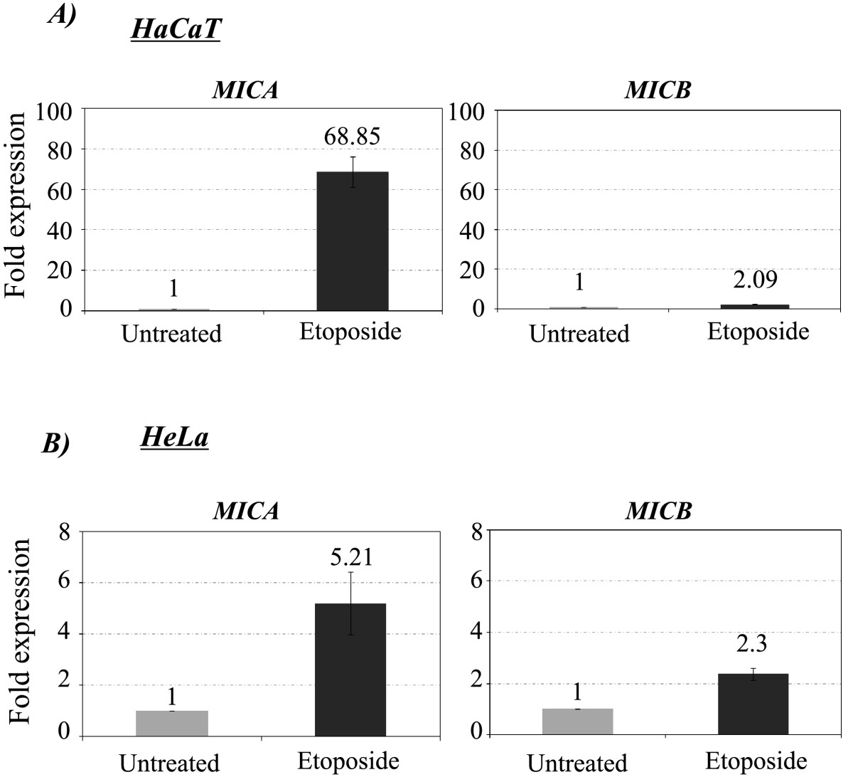 As we noted quantitative differences in the expression levels of MICA and MICB genes, we speculated that both genes might respond differentially to several stimuli, such as those induced by genotoxic stress. To address this question, one HPV-negative and one HPV-positive cell line (HaCaT and HeLa, respectively) were treated with 170 μM etoposide for 4 h and MICA and MICB mRNA abundance was assessed by Real-Time PCR using GAPDH and β-Actin as reference genes. After 4 h of treatment, we observed that genotoxic stress caused increase in MICA mRNA in HeLa cells (5.2-fold) and in HaCaT cells (68-fold) compared to untreated cells (Figure 6). Conversely, MICB mRNA increased only two-fold after etoposide treatment in both cell lines (Figure 6). While not as striking as the changes in MICA mRNA, levels of MICB mRNA increased over two-fold after etoposide treatment (Figure 6). To follow up on this result we also measured cell surface expression of MICA and MICB in HaCaT and HeLa cells after etoposide treatment, but no significant difference was observed (data not shown). A possible explanation for this discrepancy could be the short time frame of the experiment (4 h). However, the quantitative differences observed in the mRNA levels of MICA and MICB genes suggest that both genes might respond differentially to damage stimuli.