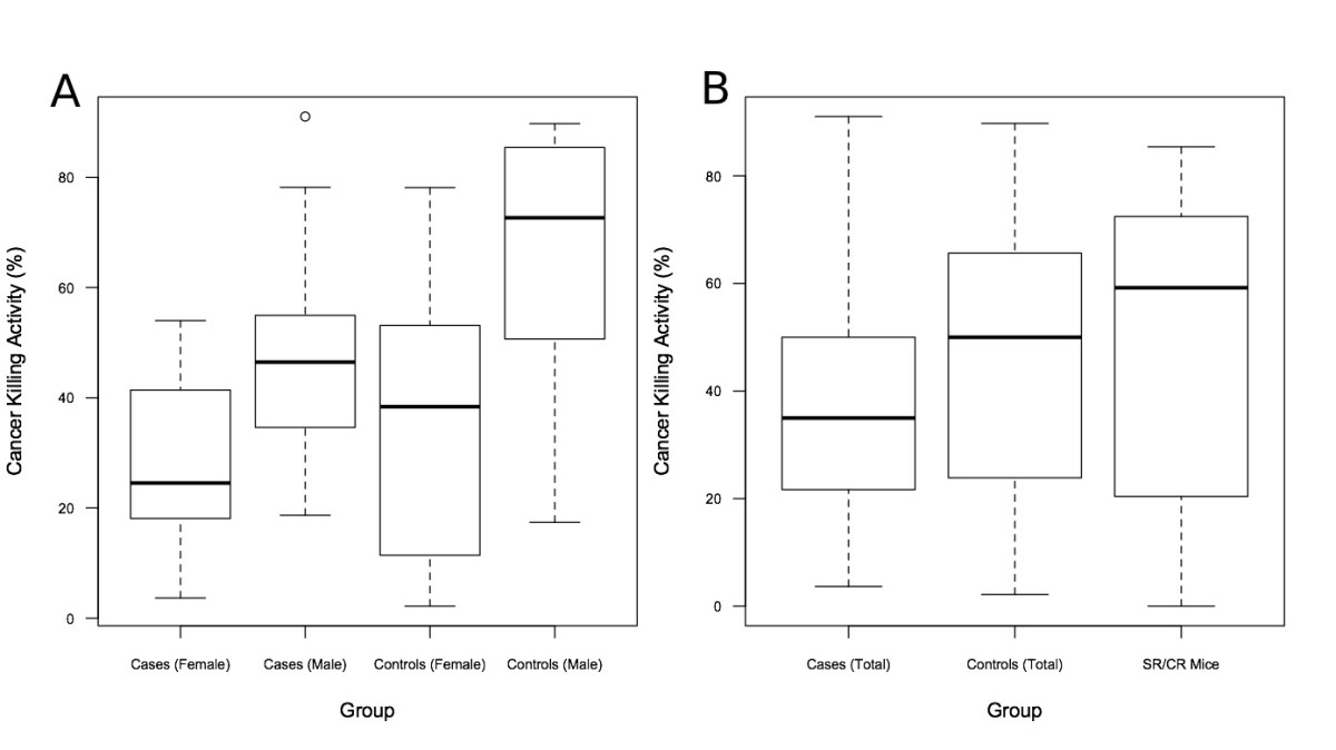 Figure 1 shows a box plot representing the CKA of seven groups. The top and bottom portions of the boxes represent the 75th and 25th percentiles, whereas the lines in the middle of the boxes represent the median or 50th percentile of the CKA distribution. The whiskers represent the upper and lower adjacent values. A) Subject groups are defined as: female cases (median = 24.5), male cases (median = 46.5), female controls (median = 38.4), and male controls (median = 72.7). B) Summary distribution of CKA values from all cases (median = 35.0) and controls (median = 50.0) as well as CKA measures obtained from thioglycollate-elicited peritoneal infiltrating leukocytes of SR/CR mice against S180 tumor targets (median 59.2).